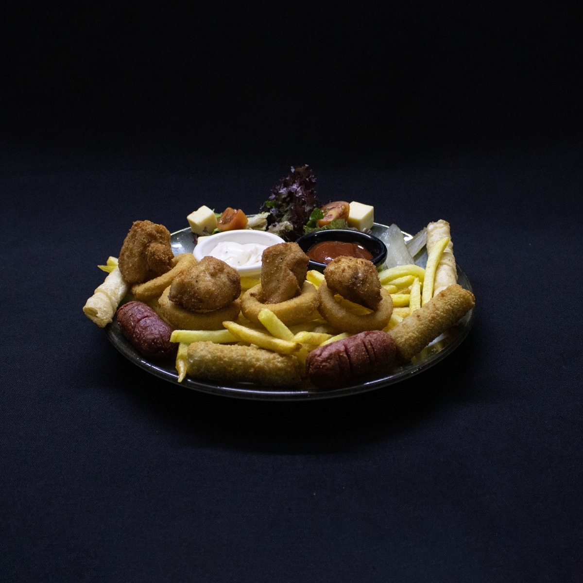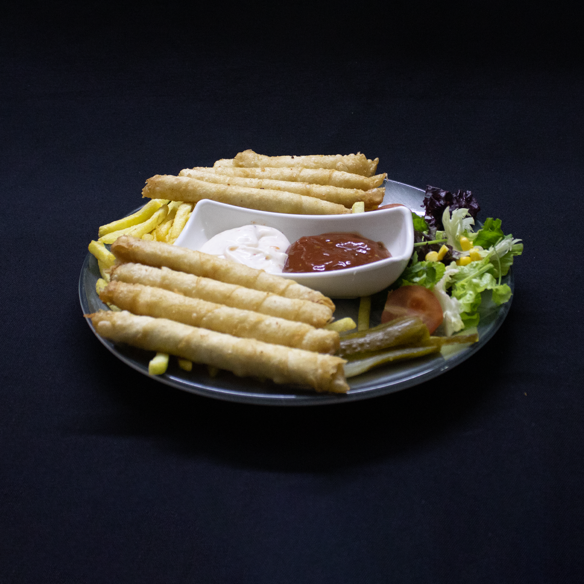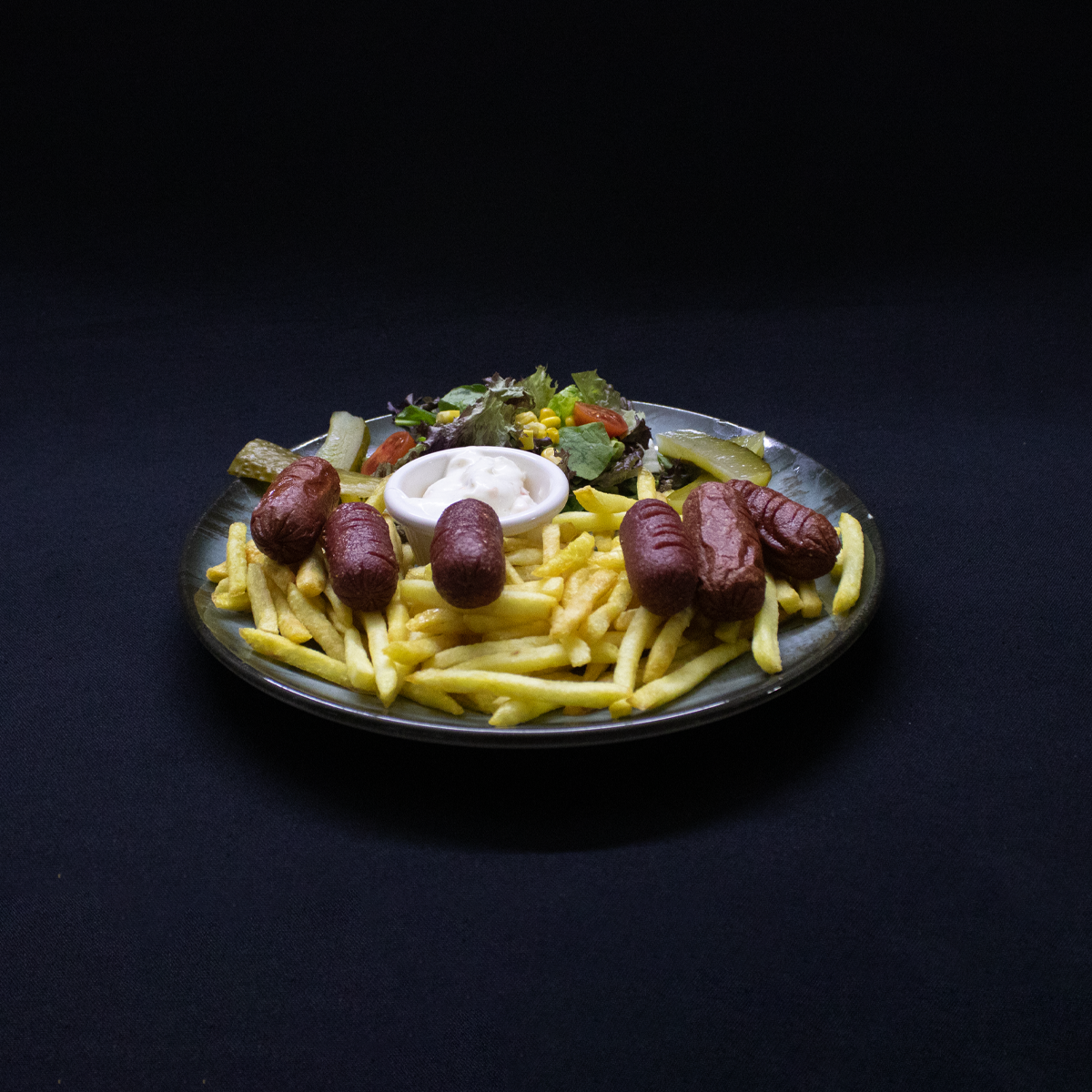 6 Adet Sosis,Patates Kızartması,Rus Salatası,Mix Yeşillik,Kornişon Turşu.