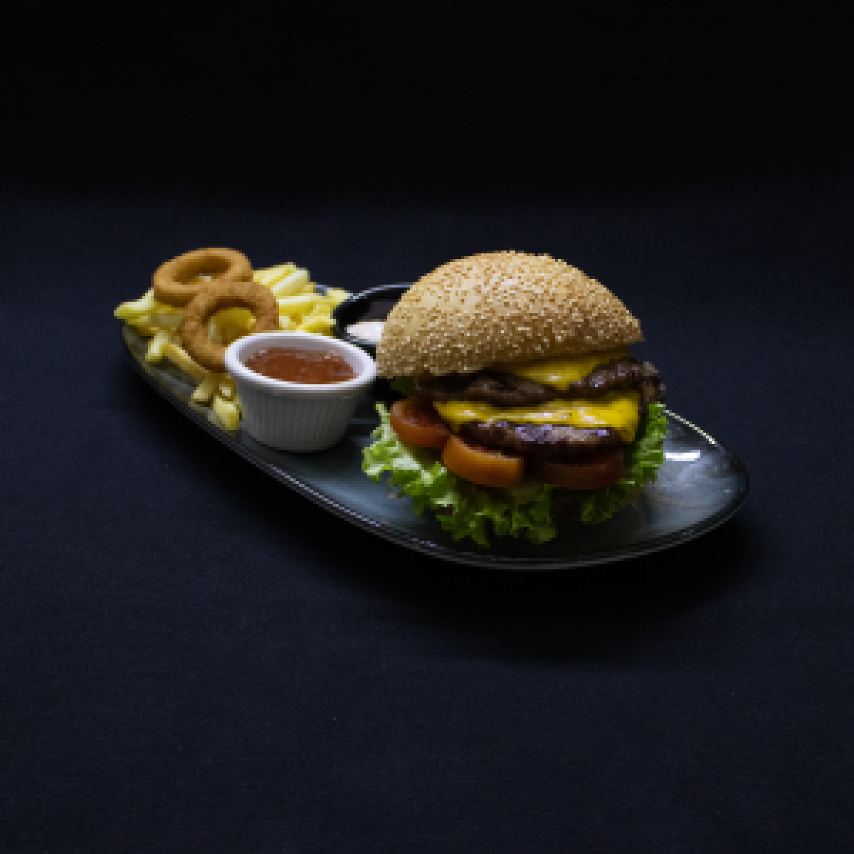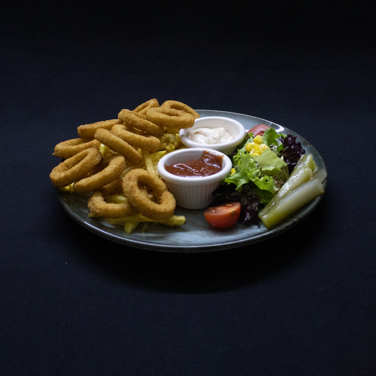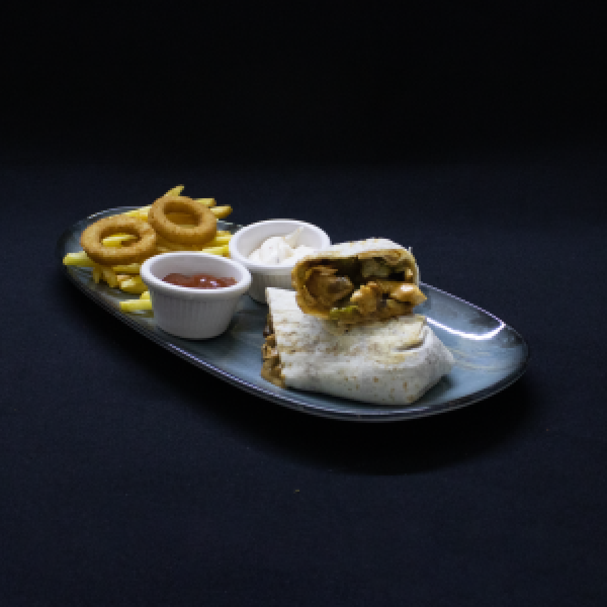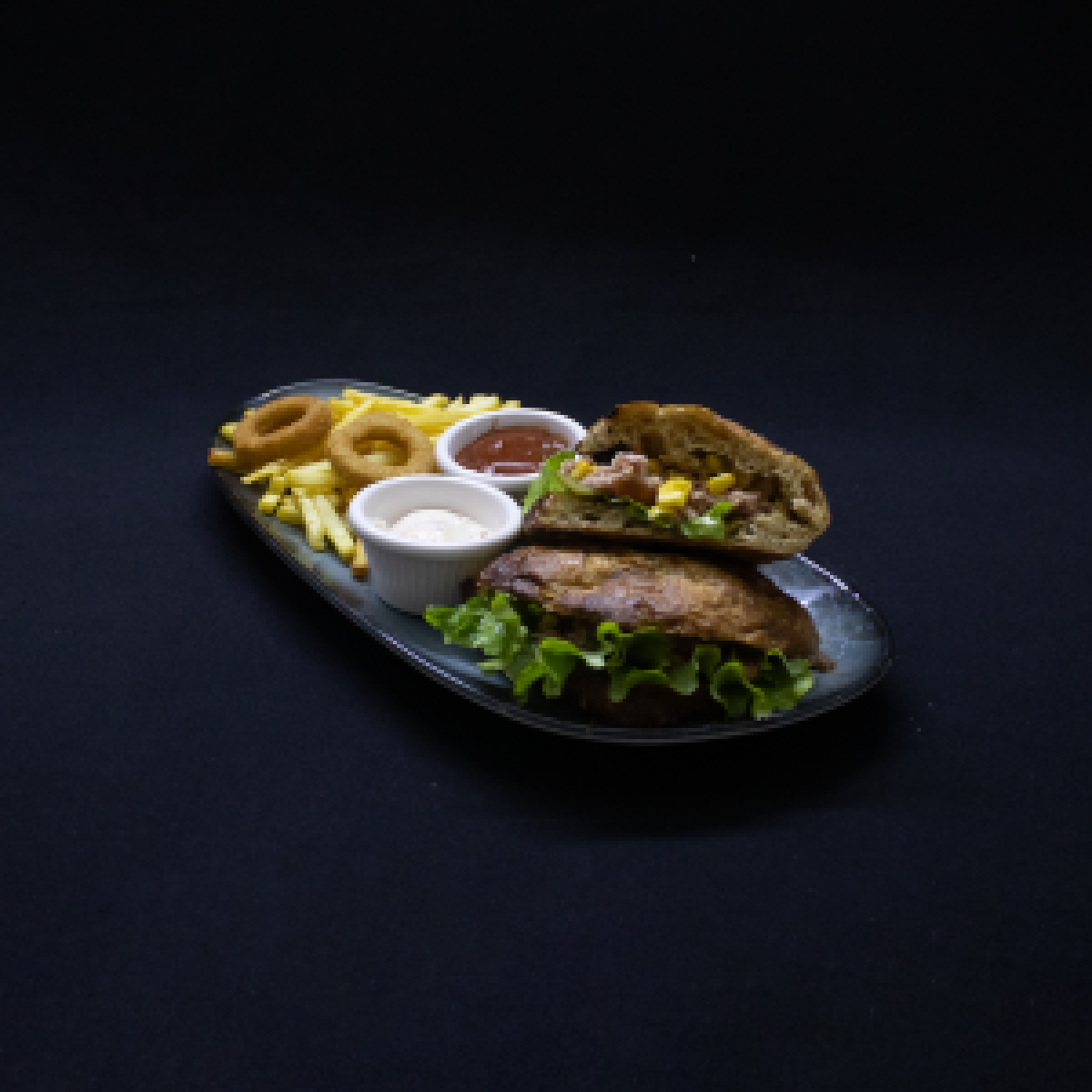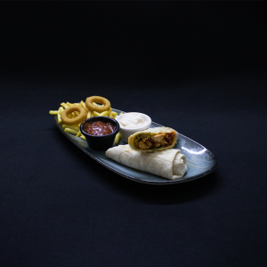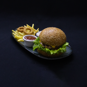 Soğan Halkası , parmak dilim patates ve özel soslar ile servis edilir.