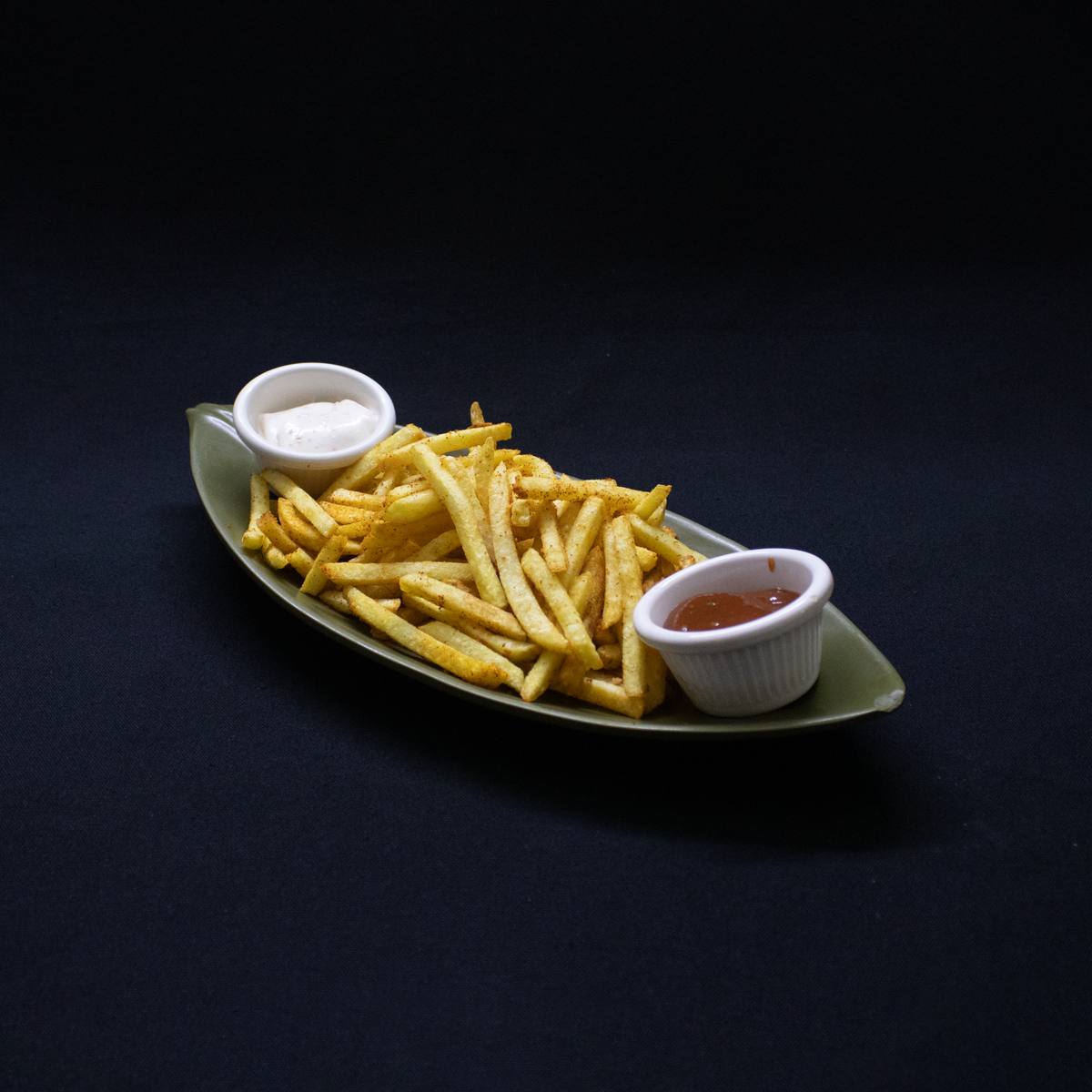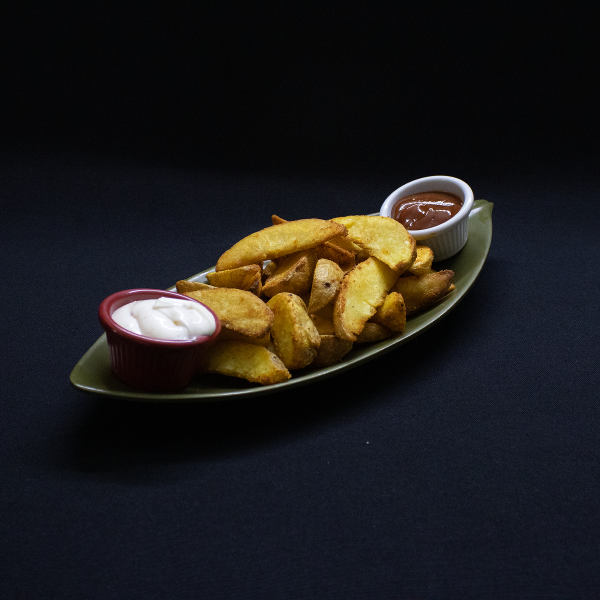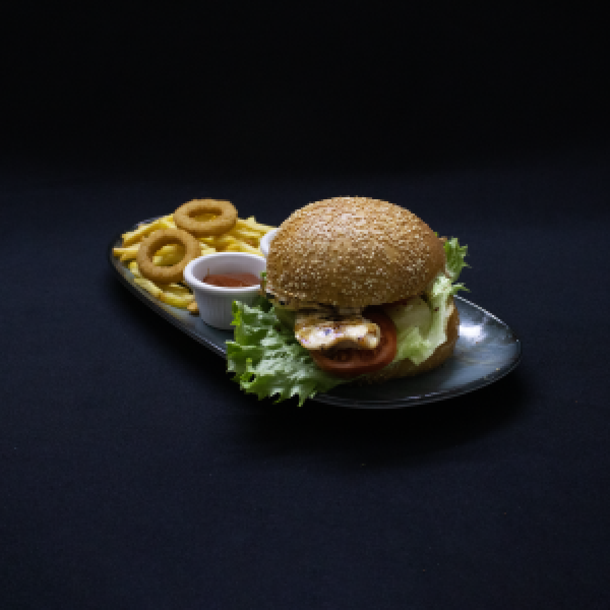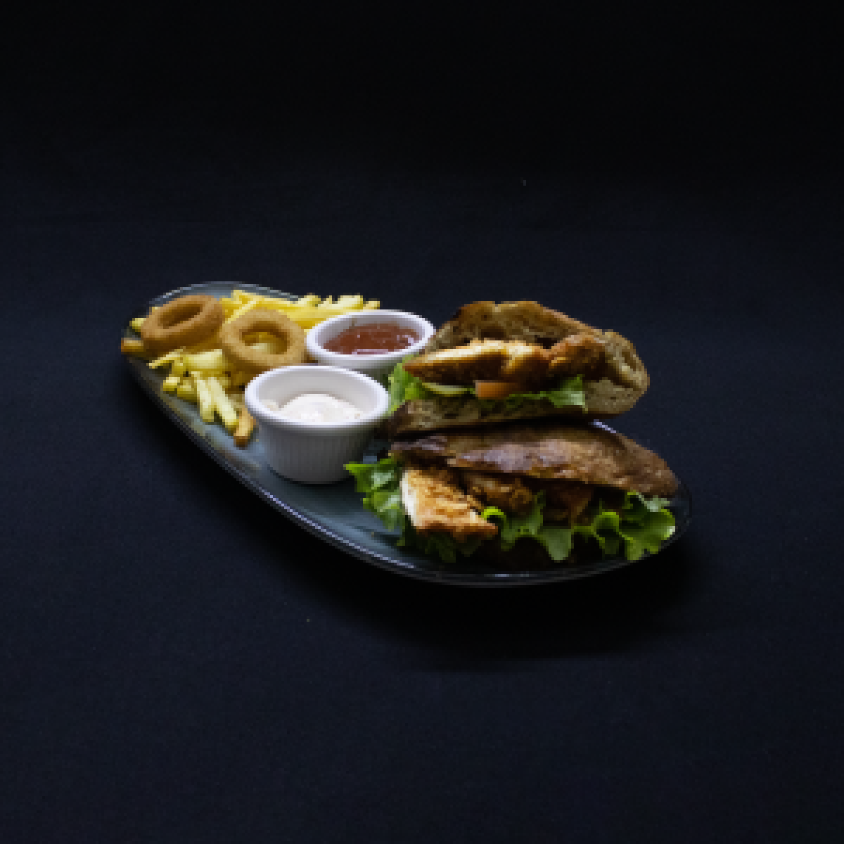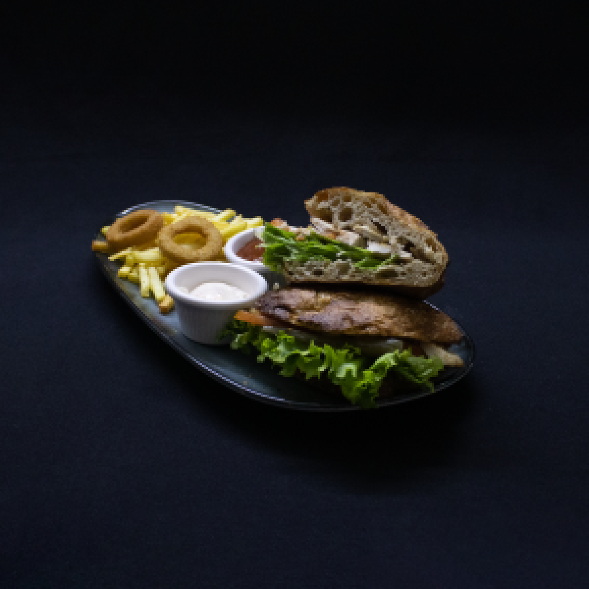 Soğan Halkası , parmak dilim patates ve özel soslar ile servis edilir.